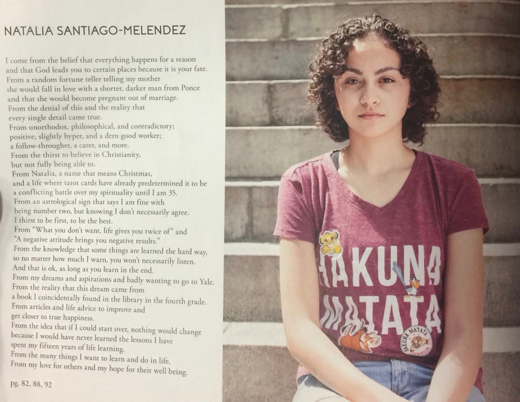 I joined the DEEP Block by Block writing program as a sophomore in high school. It’s a community-based program for young writers that takes us around the city to interview locals and express the complex themes we absorb—about life, poverty, success, love, family, support, and more—through poetry. At the end of the program, our work was published in a full collection for the year. This piece is what I wrote for my bio in the book.